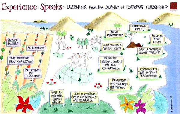 Community of practice for executives who are leading or deeply involved in the corporate citizenship efforts of their companies. Provided information design for presentations and synthesis graphic for key learnings that culminated from the 2 year program. On site graphic facilitation for executives that met to share practices and learning across business sectors.