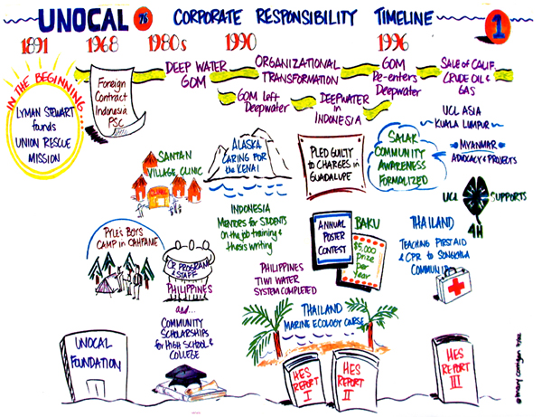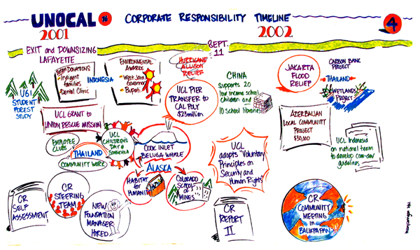 A 3 year, large scale change initiative for multinational energy company. As a member of the Whole Systems Change Team led by Myron Rogers, international consultant and author, worked with multiple business units in the US, Thailand and Indonesia. Project comprised graphic facilitation for international and regional meetings that included language and cultural translation, learning reviews after significant projects, strategic sessions, change team learning sessions. As one of the few team members to work across business units, I was the repository for much of the learning during this process.